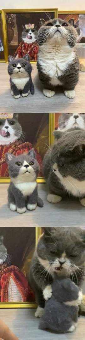 当猫咪遇上玩偶猫咪。