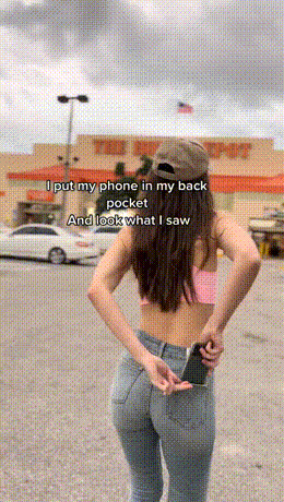 女孩进超市前把手机装进后裤兜进行拍摄